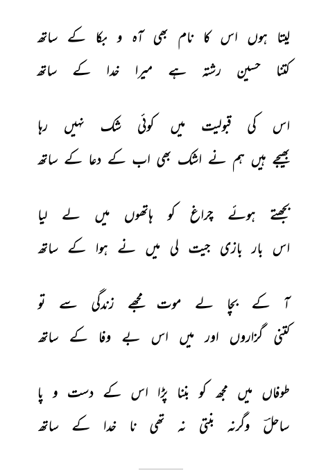 His debut collection, Maqaame Ishq, offers a refreshing departure from the common themes of earthly love (ishqe majazi). Instead, it explores the higher realms of ishqe haqeeqi — divine love — and spiritual wisdom, inviting readers into a space of reflection, purity, and timeless insight. This unique focus has earned him acclaim from leading voices in Urdu literature, including Rafat Saeed Quraishi and Ahmad Muhyuddin Hakam Aurangabadi, who have praised the soulful depth and elegance of his verse. One of the many powerful selections from Maqaame Ishq reads: