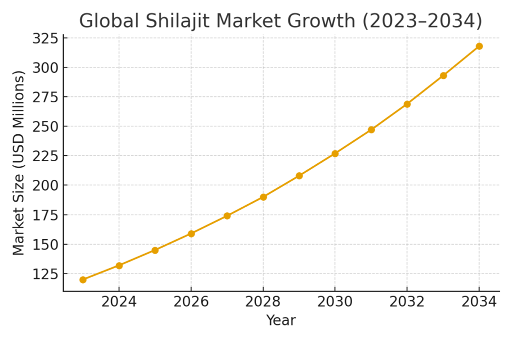 (Figure 1: Projected global market growth for Shilajit supplements from 2023 to 2034, showing steady demand increase for Shilajit tablets and natural mineral health products. Grand View Research 2024)